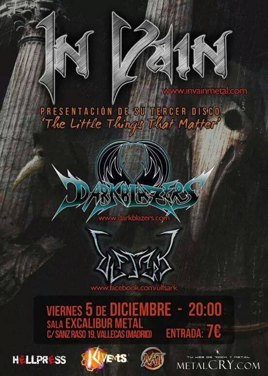 Este viernes 5 de Diciembre los Madrileños In vain estaran presentado su tercer trabajo «THE LITTLE THINGS THAT MATTER» en la sala Excalibur Metal de Vallecas estaran acompañados de los tambien Madrileños Darkblazers que tambien nos traeran temas de lo que sera su segundo album y la banda de vikin/power metal Ulfsark .