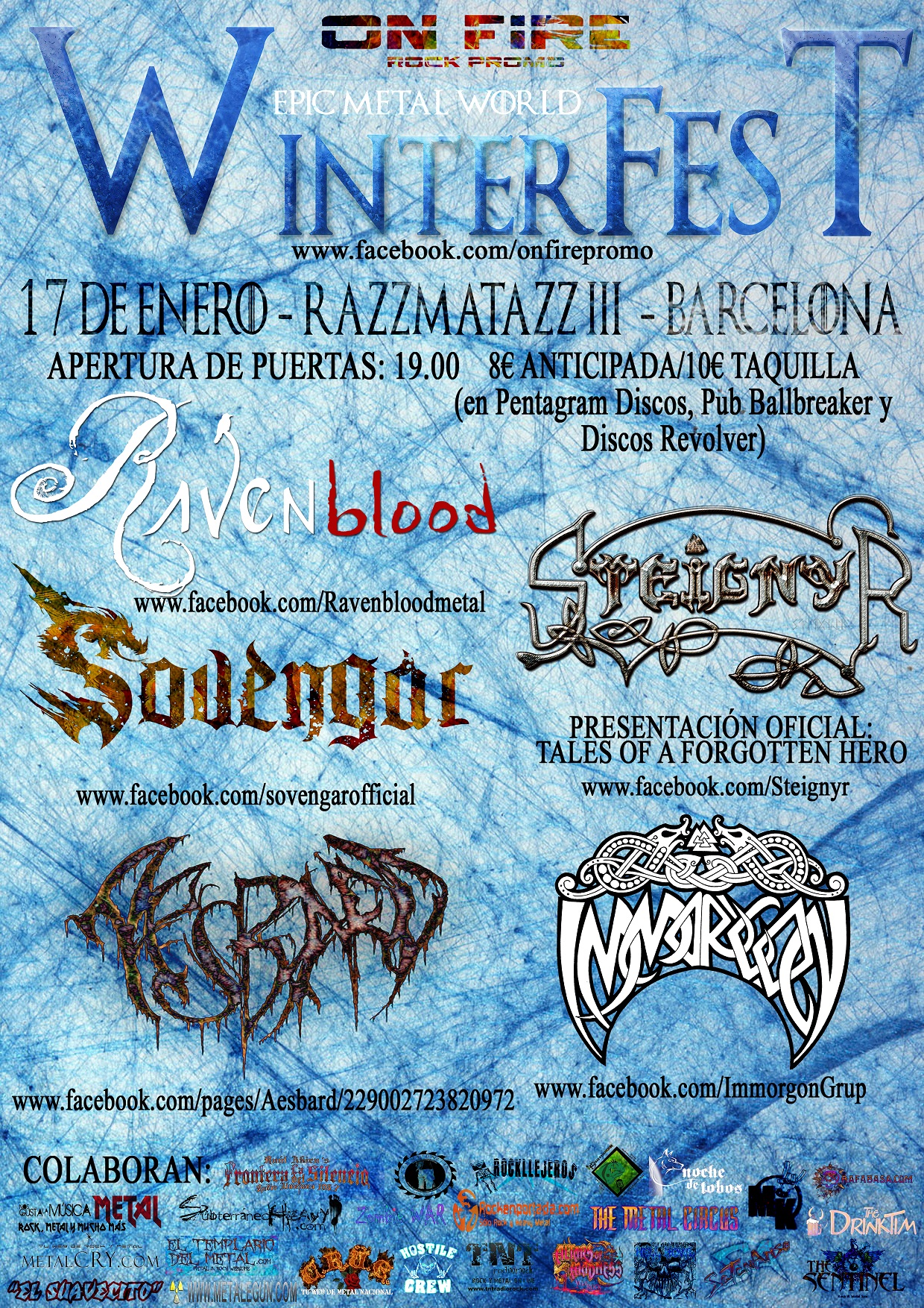Recordamos que el sábado, 17 de Enero se dará cita el debut de una nueva apuesta por la música underground, a cargo de ON FIRE Rock Promo. El Winterfest, festival de temática vikinga, folk y épica, se realizará en la sala RAZMATAZZ III siendo las siguientes bandas y su horario oficial: