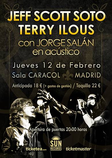 El genial vocalista de Hard Rock melódico Jeff Scott Soto une fuerzas con Terry Ilous para una gira acústica, que tendrá parada (o mejor dicho arranque) en Madrid, en febrero de 2015, con la colaboración especial del Jorge Salán.
