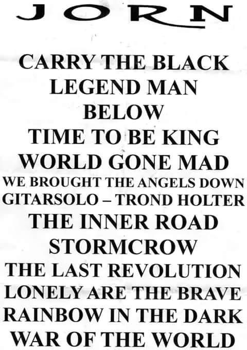 el Set list se baso principalmente en su época en soilitario tocando un tema de Masterplan » Time To Be King » y una versión de su gran influencia como abreis podido ver y escuchar en la entrevista que le hice este mismo dia horas antes Ronnie James Dio , el tema en si era «Rainbow In The Dark » con esta canción la gente se volvio loca literalmente y es que este señor la clava y estamos hablando de cantar como el mejor cantante que ha dado esta música que tanto amámos , ya para acabar todo un temazo marca de la casa como es War of the World con todo el público cantando la melodía y un Jorn que se veia ligeramente emocionado al ver la respuesta del público