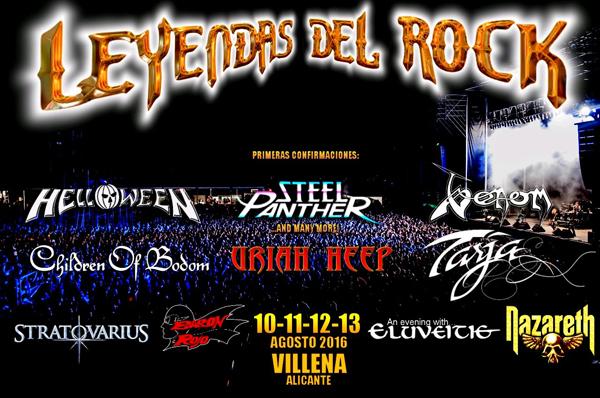 La undécima edición de Leyendas del Rock se celebrará los días 10, 11, 12 y 13 de agosto de 2016 en el Polideportivo Municipal de Villena (Alicante). El complejo deportivo cuenta con campo de fútbol de cesped natural, piscinas, zonas arboladas y amplios espacios para hacer muy agradable la estancia en el mismo. De nuevo contaremos con los dos escenarios habituales, «Azucena» y «Jesús de la Rosa», mas el apoyo del«Mark Reale Stage», ubicado bajo el techo de una pista cubierta de fútbol sala. Como de costumbre, jueves, viernes y sábado serán de pago, mientras que el miércoles, fiesta de bienvenida, continuará siendo jornada de acceso gratuito.