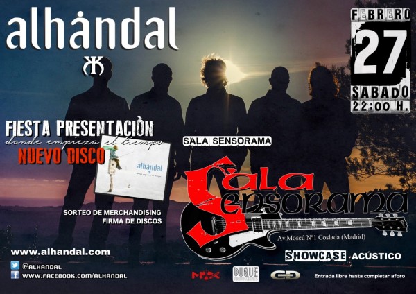 La Sala Sensorama (Coslada, Madrid), acogerá el próximo sábado 27 de febrero a las 22:00 h. la fiesta presentación del nuevo trabajo discográfico de Alhándal, un día antes a la publicación oficial del disco. La entrada será totalmente gratuita y los asistentes podrán disfrutar de un “showcase” acústico, sorteo de merchandising y firma de discos.