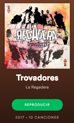 Trovadores» fue uno de los lanzamientos del 2017. Un discazo lleno de grandes temas, que esta banda revelación creó junto al productor Fernando Montesinos y que sorprende a propios y extraños. Puede escucharse en streaming y comprar tanto en tiendas físicas como en plataformas digitales. Grandes músicos, grandes canciones, una gran producción, personalidad y energía a raudales, eso es lo que ofrece LA REGADERA.