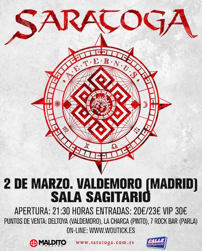 SARATOGA continúa la gira de presentación de «Aeternus», su esperado nuevo disco. Tras el éxitoso arranque de gira en Córdoba, Cuenca y Salamanca, los madrileños tocarán el próximo fin de semana en Alicante y Valdemoro (Madrid) y seguirán recorriendo las salas de todo el país durante los próximos meses.