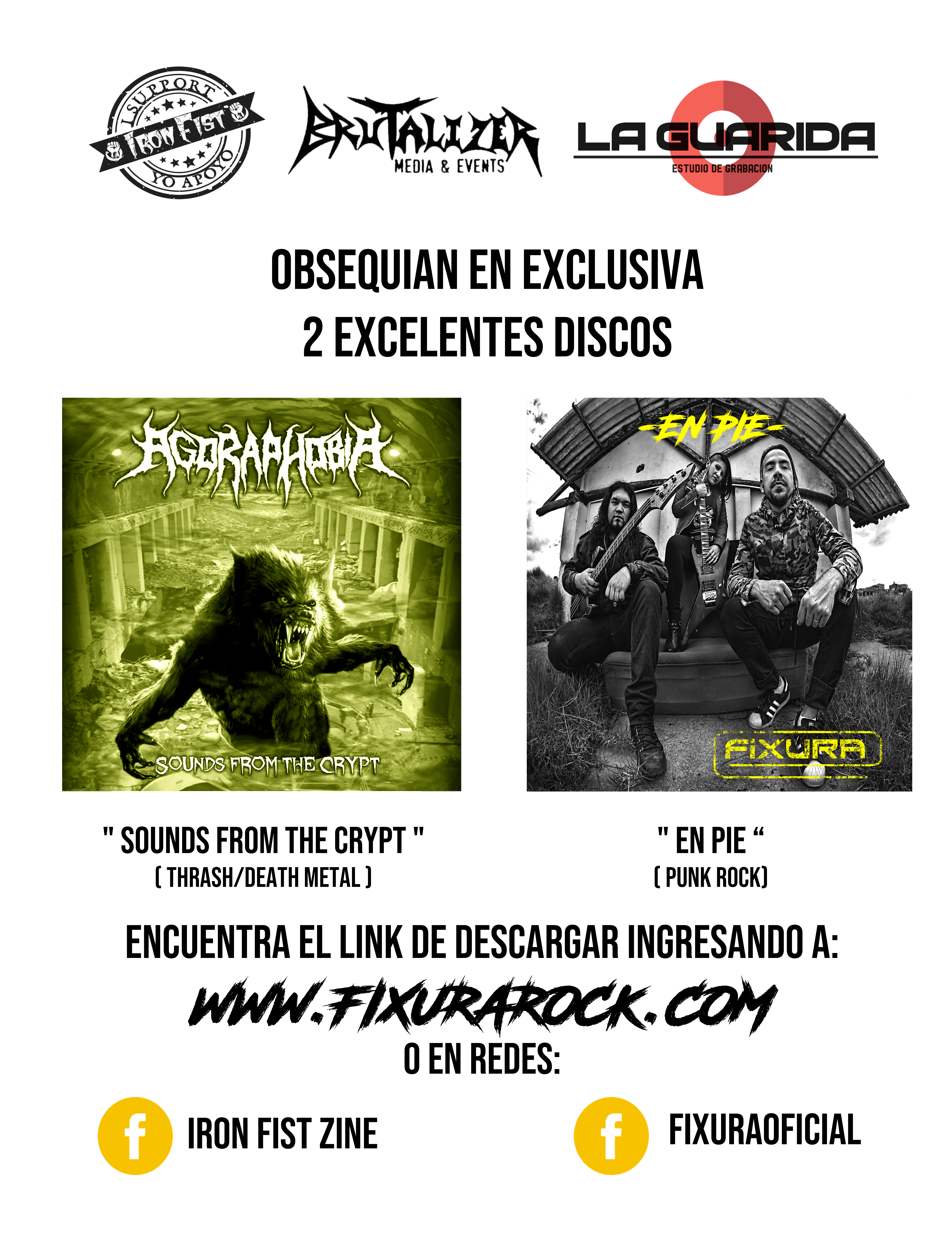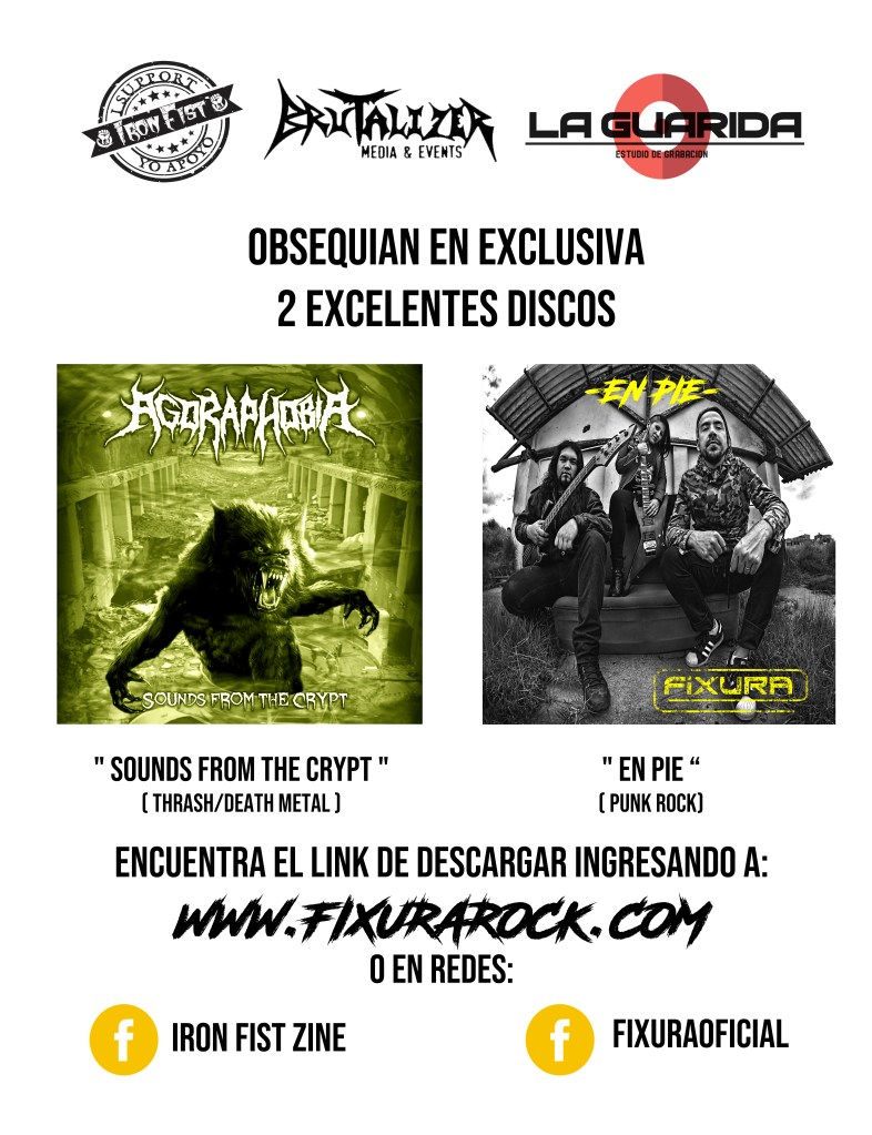 IRON FIST ZINE celebrando 30 años, en unión con BRUTALIZER MEDIA EVENTS y LA GUARIDA ESTUDIO DE GRABACION obsequian de forma exclusiva los nuevos discos de AGORAPHOBIA (SOUNDS FROM THE CRYPT) Y FIXURA (EN PÍE).