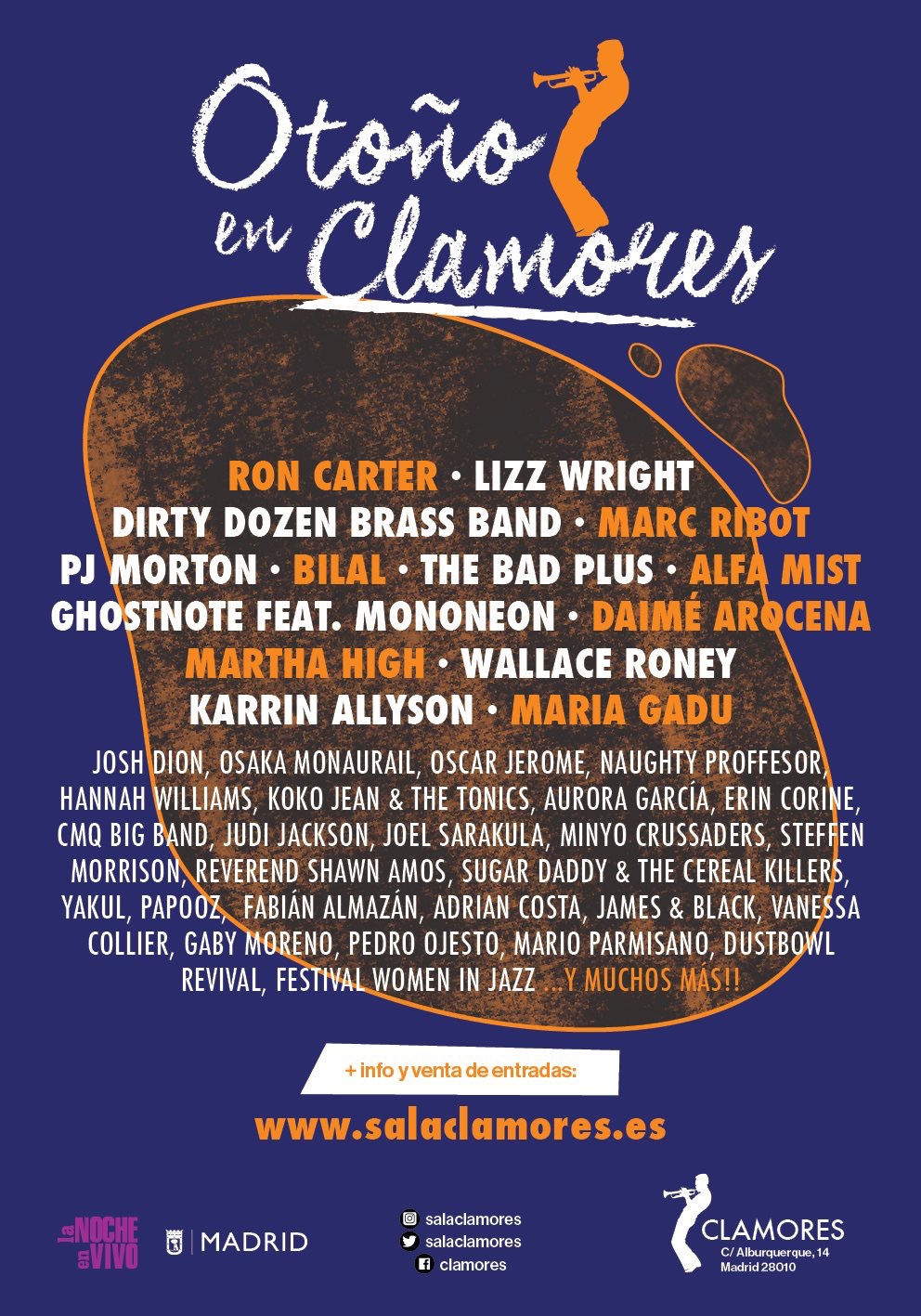 | La programación de Clamores continúa en la línea ascendente de los últimos años y, en los meses más favorables, como son los de otoño, se convierte practicamente en un festival continuo donde ver todas las semanas a algunas de las mejores bandas en sus giras internacionales. Como siempre el Jazz es el principal protagonista con leyendas como Ron Carter, el bajista con más grabaciones de la historia (+ de 3500), Wallace Roney, el alumno aventajado de Miles Davis, Lizz Wright, de nuevo en España trás un largo tiempo sin visitarnos, The Bad Plus, el mítico trío de fusión, La Dirty Dozen Brass Band, una de las 2 mejores (con la Rebirth) bandas tradicionales de New Orleans de todos los tiempos, Marc Ribot, el mítico guitarrista de Tom Waits o Elvis Costello con su nuevo proyecto, la veterana y elegante vocalista Karryn Allyson o el batería Josh Dion. |