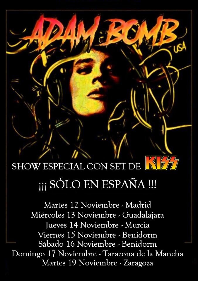 El guitarrista norteamericano Adam Bomb volverá a España en Noviembre presentando un show único y especial en el que LOS CONCIERTOS CONSTARÁN DE DOS PARTES: Una primera con algunas de sus canciones propias, en las que estará el bajista polaco Kozzy Kozerawski, y una segunda en la que repasará un buen puñado de canciones de KISS, en la que volverá a estar el bajista español Diego Prieto, que ya le acompañó en el tour 2017.