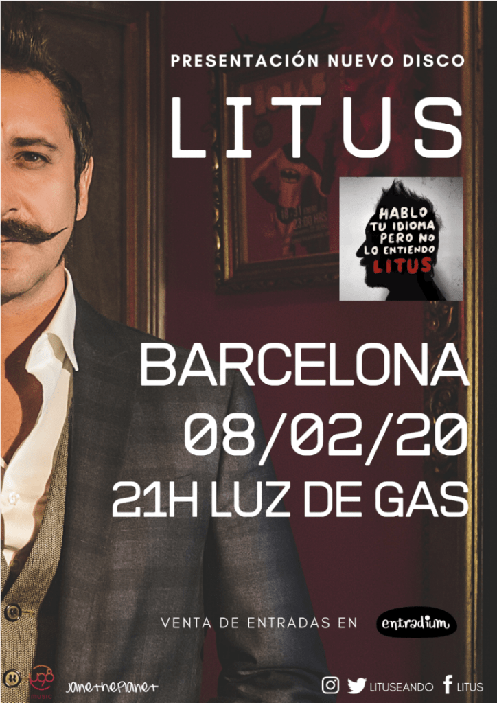 | LITUS Presenta en directo «Hablo tu idioma pero no lo entiendo» , en Madrid y Barcelona Presentaciones en directo 19 de diciembre , 21:00h. Café Berlín, Madrid Entradas anticipadas aquí 8 de febrero , 21:00h. Luz de Gas, Barcelona Entradas anticipadas aquí HABLO TU IDIOMA PERO NO LO ENTIENDO, un título inspirado en la canción que compuso para la obra de teatro ‘La puerta de al lado’, dirigida por Sergio Peris-Mencheta se publica el próximo 8 de noviembre. En él todas las canciones se titulan con nombres y apellidos y en el que, según el propio artista : ‘la manera de avanzar o de innovar no ha consistido en ir hacia adelante, sinó en quedarme quieto y observar qué ocurría hacia los lados’.Portada: Andreu Buenafuente Fotos : Iván Martínez SegoviaYA PUEDES ESCUCHAR Y DISFRUTAR DE HABLO TU IDIOMA PERO NO LO ENTIENDO AQUí : SMART LINK VideoClip LITUS Hamish StuartSigue a Litus : |