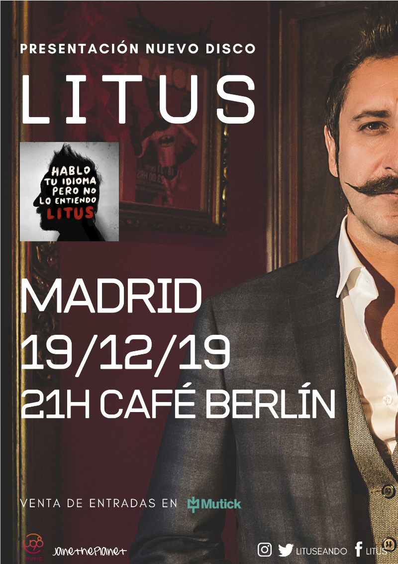 | LITUS Presenta en directo «Hablo tu idioma pero no lo entiendo» , en Madrid y Barcelona Presentaciones en directo 19 de diciembre , 21:00h. Café Berlín, Madrid Entradas anticipadas aquí 8 de febrero , 21:00h. Luz de Gas, Barcelona Entradas anticipadas aquí HABLO TU IDIOMA PERO NO LO ENTIENDO, un título inspirado en la canción que compuso para la obra de teatro ‘La puerta de al lado’, dirigida por Sergio Peris-Mencheta se publica el próximo 8 de noviembre. En él todas las canciones se titulan con nombres y apellidos y en el que, según el propio artista : ‘la manera de avanzar o de innovar no ha consistido en ir hacia adelante, sinó en quedarme quieto y observar qué ocurría hacia los lados’.Portada: Andreu Buenafuente Fotos : Iván Martínez SegoviaYA PUEDES ESCUCHAR Y DISFRUTAR DE HABLO TU IDIOMA PERO NO LO ENTIENDO AQUí : SMART LINK VideoClip LITUS Hamish StuartSigue a Litus : |