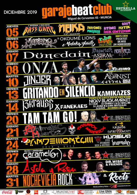 | En las próximas semanas pasarán por Garaje Beat Club: TAM TAM GO! + EL AVISPERO DJ // ANIMALES MUERTOS + TXULAPOS MUERTOS + KAGANDO ENTRE 2 COCHES // KURSIVA + DRUMMAKER + SEEK & DESTROY + 5TER + DRAMANE // CARAMELO + EL AVISPERO DJ // ASTOLA Y RATÓN + DR. WISE & FRIENDS // NOCHEVIEJA ROCK & ROOTS // BASSGAME NOCHE DE REYES // GREEN COVERS [Tributos a MUSE, COLDPLAY y PLACEBO] // ASFALTO // ELLIOTT MURPHY & OLIVIER DURAND // MÁRTIRES DEL COMPÁS // OBÚS // GATIBU // LEO JIMÉNEZ + SYLVANIA + DARKNOISE + SEVENTH HELL + ÚLTIMO ECO // PENÚLTIMO TRIBUTO [Tributo a EL ÚLTIMO DE LA FILA]… y muchos más. www.garajebeatclub.comwww.facebook.com/garajebeatclub la marca del rock en Murcia INFORMACIÓN, PROGRAMACIÓN Y PRODUCCIÓN: isaac@factorq.com |
