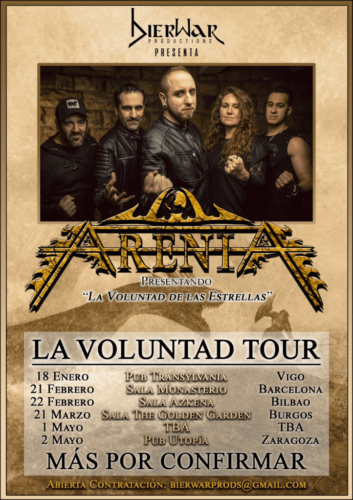 Nos complace anunciar la gira «La Voluntad Tour» en la que Arenia presentará su último y espectacular disco «La Voluntad de las Estrellas». Estarán acompañados de los mallorquines Eveth, que también están inmersos en la presentación de su gran disco «Puerta Áurea» editado por Rock Estatal Records, y de bandas como Quarzum en Vigo, Dhaliax en Barcelona o Fear Crowd en Bilbao.