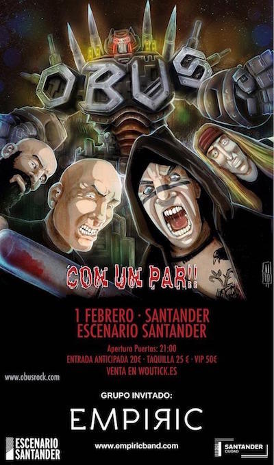 OBUS sigue su gira «Con Un Par» este fin de semana en Oviedo y Santander. Mira la actuación de OBUS em Late Motive OBÚS ha comenzado la gira de presentación de su nuevo álbum, «Con Un Par», con dos conciertazos en Valencia y Murcia.. El grupo tocará el fin de semana en Oviedo y Santander y continuará girando durante los próximos meses demostrando, una vez más, que los años no pasan por el combo madrileño, cuya fuerza y energía siguen intactaas ¡No te los pierdas! OBUS ha estado promocionando este nuevo álbum en diferentes medios nacionales y extranjeros. A continuación puedes ver algunos de ellos: Entrevista con BuenafuenteTelemadrid RNE Cadena Ser Radio Marca La Jungla Radio 4G Conexión Rock Rock FM Diario Levante La provincia Diario de Almería Salamanca 24 horas Murcia![]() ValenciaEstos son sus próximos conciertos. Pronto anunciaremos nuevas fechas. 31 de enero. Oviedo. Sala Sir Laurens 1 de febrero. Santander. Escenario Santander 14 de febrero. Valladolid. Sala Lava 15 de febrero. Madrid. Escena Rock -Ifema 22 de febrero. Zaragoza. Teatro Las Esquinas 29 de febrero.Salamanca. Sala Potemkin 6 de marzo. Barcelona. Sala Razzmatazz 27 de marzo. Tarragona. Sala Zero 13 de marzo. Bilbao. Sala Stage Live 14 de marzo. Vitoria. Sala Jimmy Jazz 20 de marzo. Málaga21 de marzo. Miranda de Ebro 24 de abril. A Coruña. Sala Mala Vida 25 de abril. Vigo. Sala Rouge Compra tus entradas Sigue la gira en Facebook ![]() «Con Un Par» son doce nuevos temas grabados en los Estudios New Life (Saratoga, Ars Amandi…) bajo la producción de Bori Alarcón (Ariel Rot, Pereza, Jorge Drexler, Estopa, Pablo Alborán…), uno de los productores más prestigiosos del país, quien ha llevado el sonido clásico de OBÚS un paso más allá, con una producción digna de una leyenda de su calibre.¡Reserva ya tu copia!Mira el nuevo videoclip de OBÚS «Sangre de Rock N’ Roll «Mira el video-lyric de «Whiskey Con Hielo» .Mira el videoclip de «No Me Lo Digas Más» Mira el videoclip de «El Pastel Del Demonio» Algunas fotos de su anterior gira: ![]() ![]() ![]() ![]() Burgos Binefar (Huesca)![]() ![]() Cáceres![]() ![]() Donosti Vigo Folgoso de la Ribera (León) Ciudad Real![]() Arucas (Gran Canaria) Festival Leyendas del Rock![]() ![]() ![]() ![]() ![]() ![]() Madrid![]() ![]() ![]() Rockfest (Barcelona)![]() ![]() Pamplona![]() ![]() ![]() ![]() çLa Riviera (Madrid)![]() ![]() Barcelona![]() ![]() Faro (Portugal) A Coruña Mejorada del Campo (Madrid)![]() ![]() Islas Canarias![]() ![]() Puerto de Mazarrón (Murcia) Isla Cristina (Huelva)![]() Zamora![]() Madrid Almería![]() ![]() Alcobendas (Madrid)![]() ![]() ![]() Sevilla![]() ![]() Valencia Aranda De Duero (Burgos) Síguelos en:www.obusrock.com![]() |