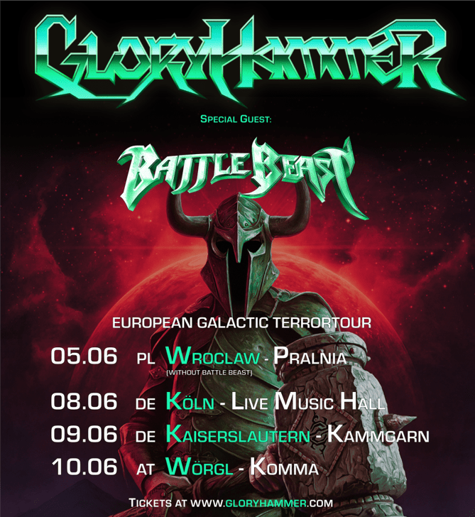 Después de haber lanzado su álbum de estudio Legends From Beyond The Galactic Terrorvortex (DE # 6, CH # 8, AT # 16, SC # 25), GLORYHAMMER continúa conquistando Europa con un vórtice interestelar en 2020. Después de terminar el primer Como parte del exitoso Terrortour Galáctico Europeo, los maestros de la galaxia continúan su viaje a través de Europa con cuatro impresionantes espectáculos principales en Alemania, Austria y Polonia este verano con el invitado especial Battle Beast, además de las apariciones ya anunciadas del festival.