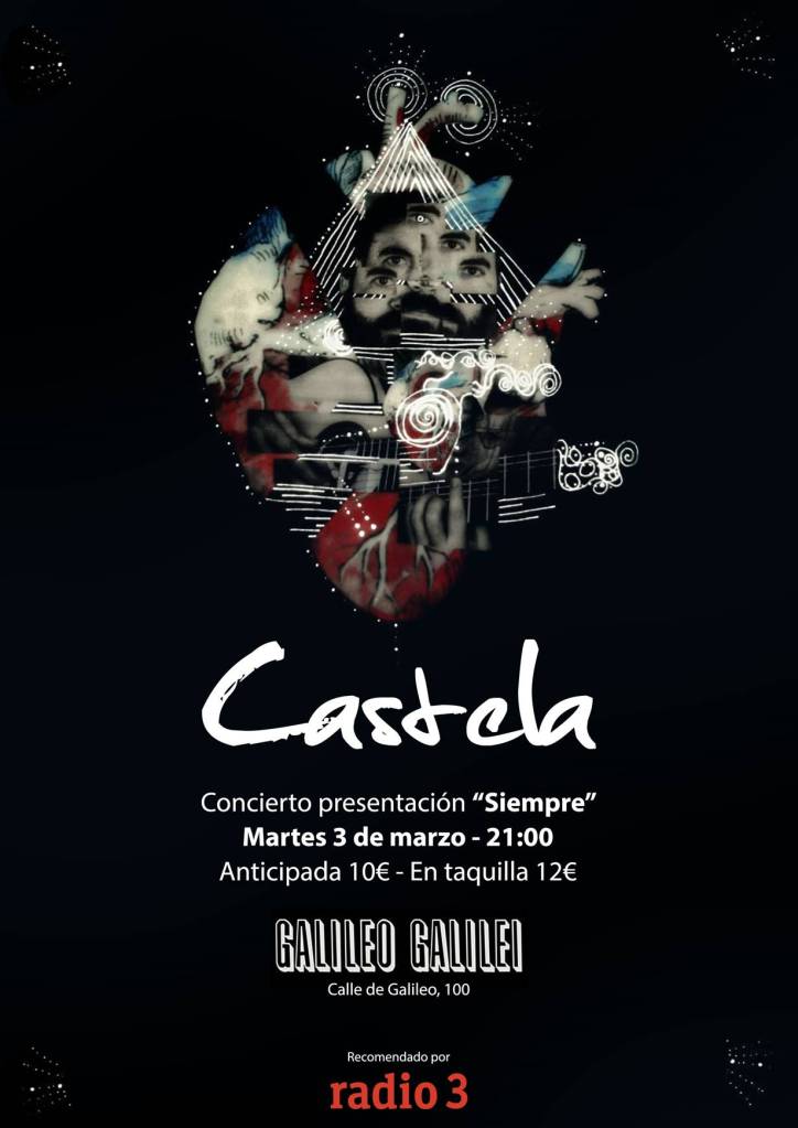 CASTELA es el proyecto en solitario de Samuel Castela, ex vocalista y líder del grupo Calocando, banda paralela de Jorge González (Vetusta Morla). Grupo fusión que consiguió afianzarse en el panorama musical nacional hace unos años con logros que los llevó a dar, entre otros muchos, un concierto en el Cuartel Conde Duque de Madrid o participar en Los conciertos de Radio 3 de TVE, además de actuar por las salas más relevantes del país.