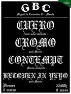 | CUERO + CROMO + CONTEMPT BETOVEN IN YEYO Viernes 6 de marzo · 22:00 · Roots World Music Club (MURCIA)Entrada en taquilla: 8 eurosLos bilbaínos CUERO presentan «Todo hierro», un 12″ de una sola cara con seis canciones de rabioso, contundente, crudo y oscuro trve kvlt oi!, en un breve pero intenso show que tendrá lugar en la sala más underground del sureste estatal, situada en el piso superior de Garaje Beat Club. Auténticos black metal skinheads que comparten cartel con el trío murciano CROMO, proyecto paralelo de Guille Balboa de NUEVA GENERACIÓN y The Safety Pin Generation, los skins murcianos CONTEMPT y los degenerados BETOVEN IN YEYO, banda de punk nacida en las alcantarillas del Segura con el único objetivo de llegar al público que colma los afters de nuestra ciudad.