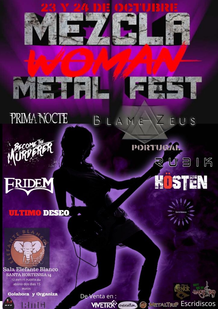 Hola desde el Woman Metal Mezcla fest. os dejamos la nueva fecha si el covid-19 lo permite ojala que si . Del 23 y 24 de Octubre en Madrid. sala el Elefante Blanco , y 25 de Octubre sala Rockville. Desde el woman mezcla metal fest esperemos que se pueda realizar este festival ,,,desglose del festival por dias Woman Metal Mezcla Fest los próximos días 23 ,24 de 2020 en la sala Elefante Blanco de Madrid. 25 de octubre Rockville