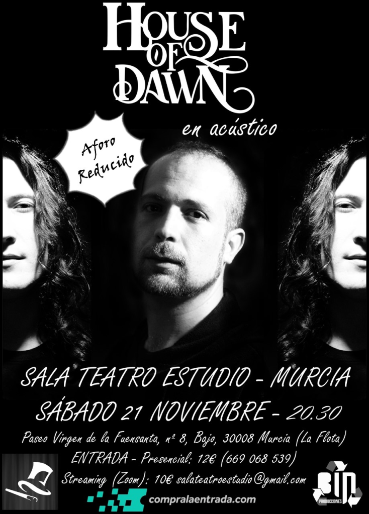 House Of Dawn ofrecerá un directo acústico online (Streaming) el próximo 21 de Noviembre en Sala Teatro Estudio de Murcia, donde podrán además asistir un numero reducido de personas para disfrutarlo de forma presencial.