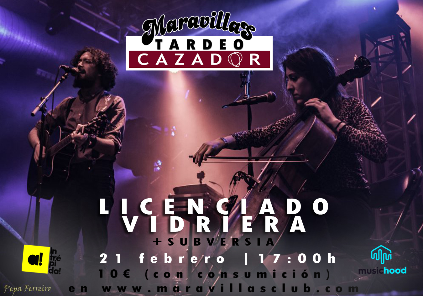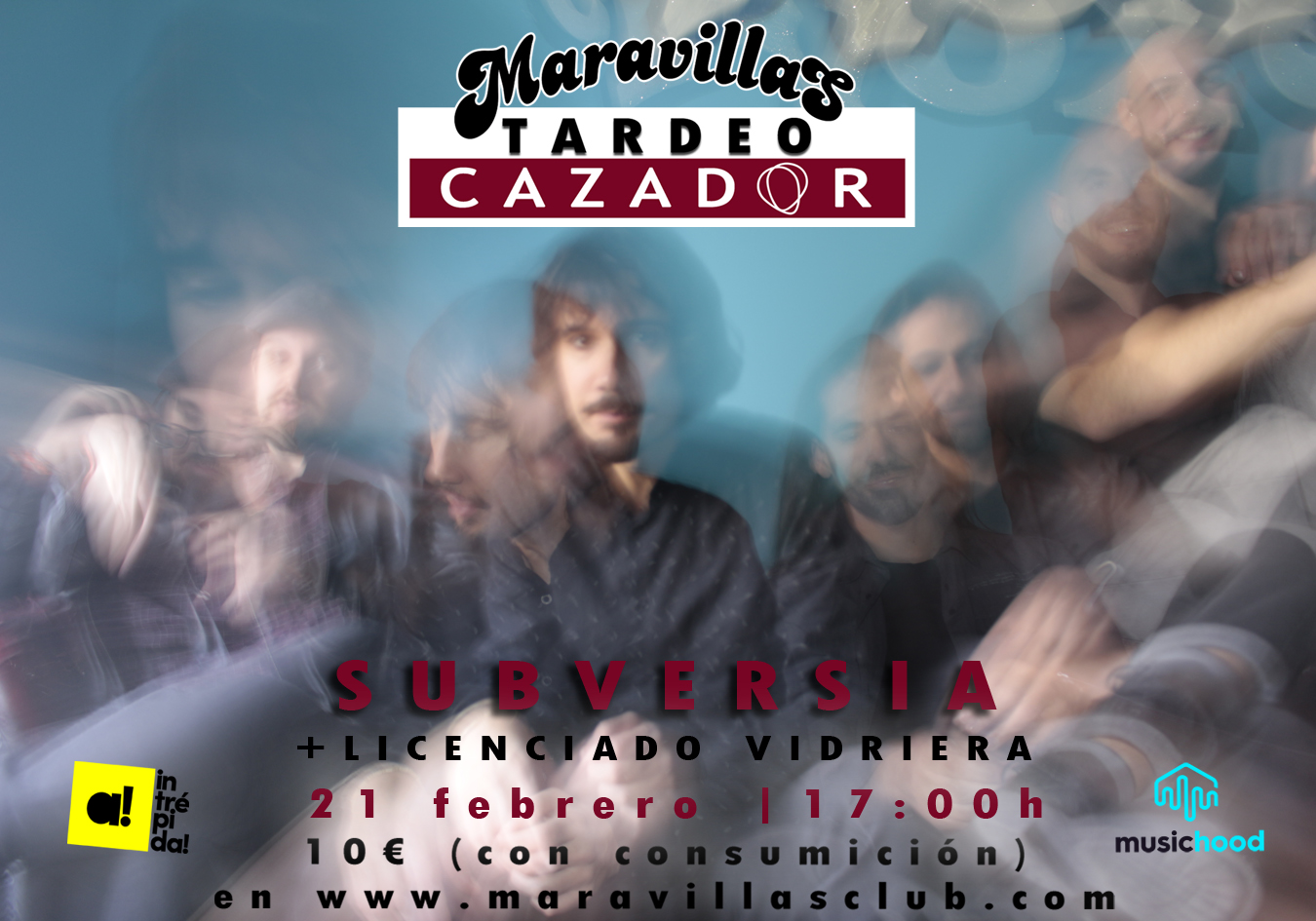 | Tardeo Cazador de MusicHunters SUBVERSIA + LICENDIADO VIDRIERA Maravillas Club, 21 de febrero, A.P. 17:00h Entradas: 10€ (con consumición) en Wegow |