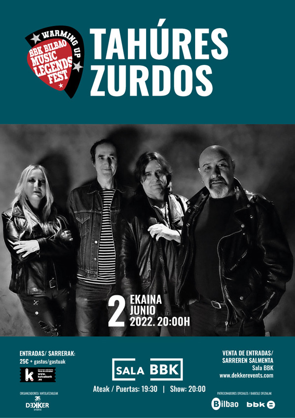 | TAHÚRES ZURDOS (Pamplona, 1987), se une al WARMING UP del BBK BILBAO MUSIC LEGENDS FEST y dará por finalizado este calentamiento para el «LEGENDS» el día 2 de junio en la Sala BBK (Bilbao). Tahúres Zurdos viene a la Sala BBK con toda su energía y con temas de toda su trayectoria que nos harán disfrutar de lo que será un gran concierto. No sin esfuerzo y demostrando su valía, llevan 35 años en la música siendo una banda legendaria que desde su gran tema “Una noche de amor” (Tahuría 1990) compuesta por Aurora para Bellandona (su formación anterior) y recuperada para Tahúres Zurdos, han cosechado grandes éxitos como “Tocaré” y “Afiladas” del álbum “Nieve Negra” (1991). En 2004 deciden separase y para conmemorar su trayectoria que en aquel entonces ya era de 17 años, sacan su noveno trabajo titulado “17 años” grabado en directo. 15 años después, en 2019 Tahúres vuelve a reunirse en un concierto benéfico para la Fundación Síndrome de Dravet y ante un sold out en la sala Zentral de Pamplona, deciden volver a los escenarios, vuelta que queda parada por la pandemia de la Covid-19, y se reanuda de cara al 2021. El 2 de junio de este año, la Sala BBK acogerá a la banda al completo. Al igual que para los conciertos del «Warming up» anteriores, se habilitarán invitaciones limitadas para quienes ya hayan comprado entradas para el BBK BILBAO MUSIC LEGENDS FEST, o lo hagan próximamente. |