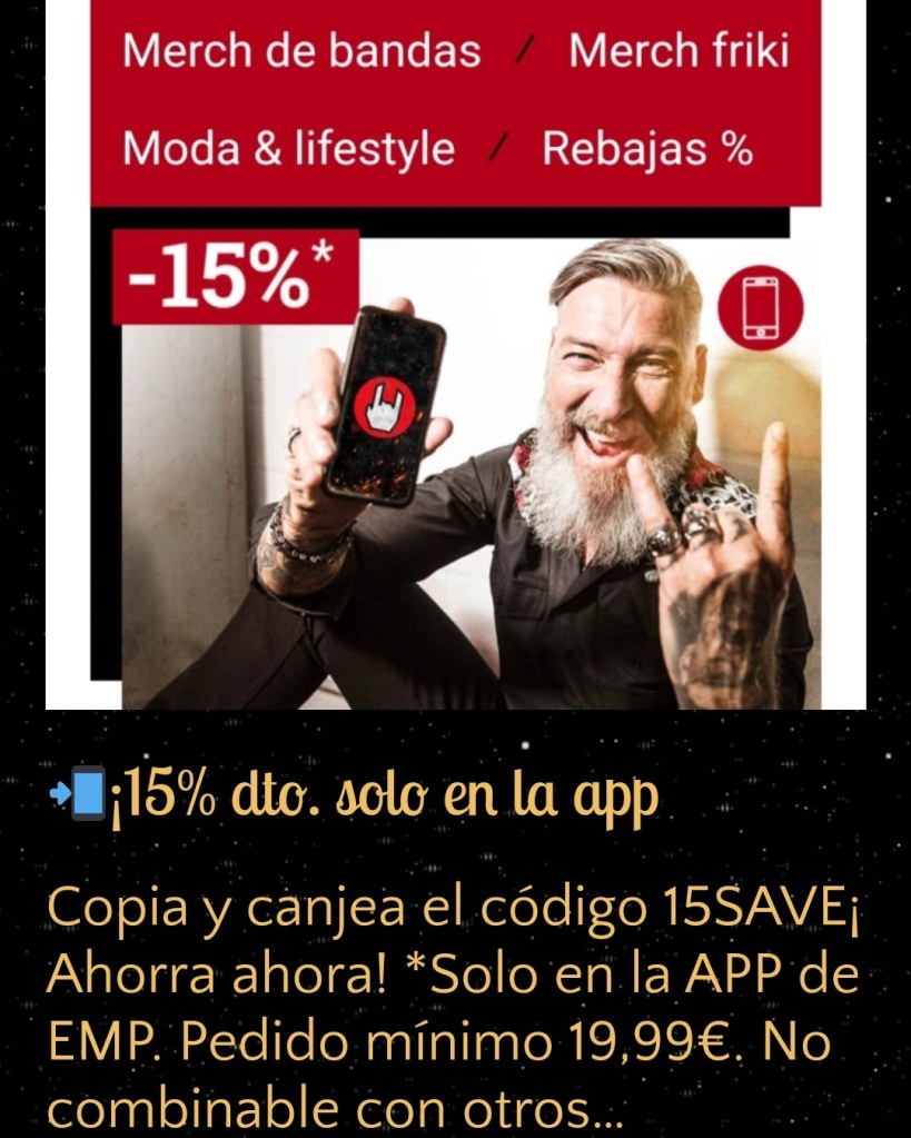 Solo en la APP de EMP. Pedido mínimo 19,99€. No combinable con otros códigos promocionales. Libros, media (CDs, DVDs, LPs…), tickets, Funko Pop!, Rammstein, Böhse Onkelz, cheques-regalo y artículos que incluyen una donación en el precio están excluidos de la promoción. El 15% de descuento será aplicado en el primer paso del proceso de compra después de introducir el código. Válido hasta el 23.08.2022