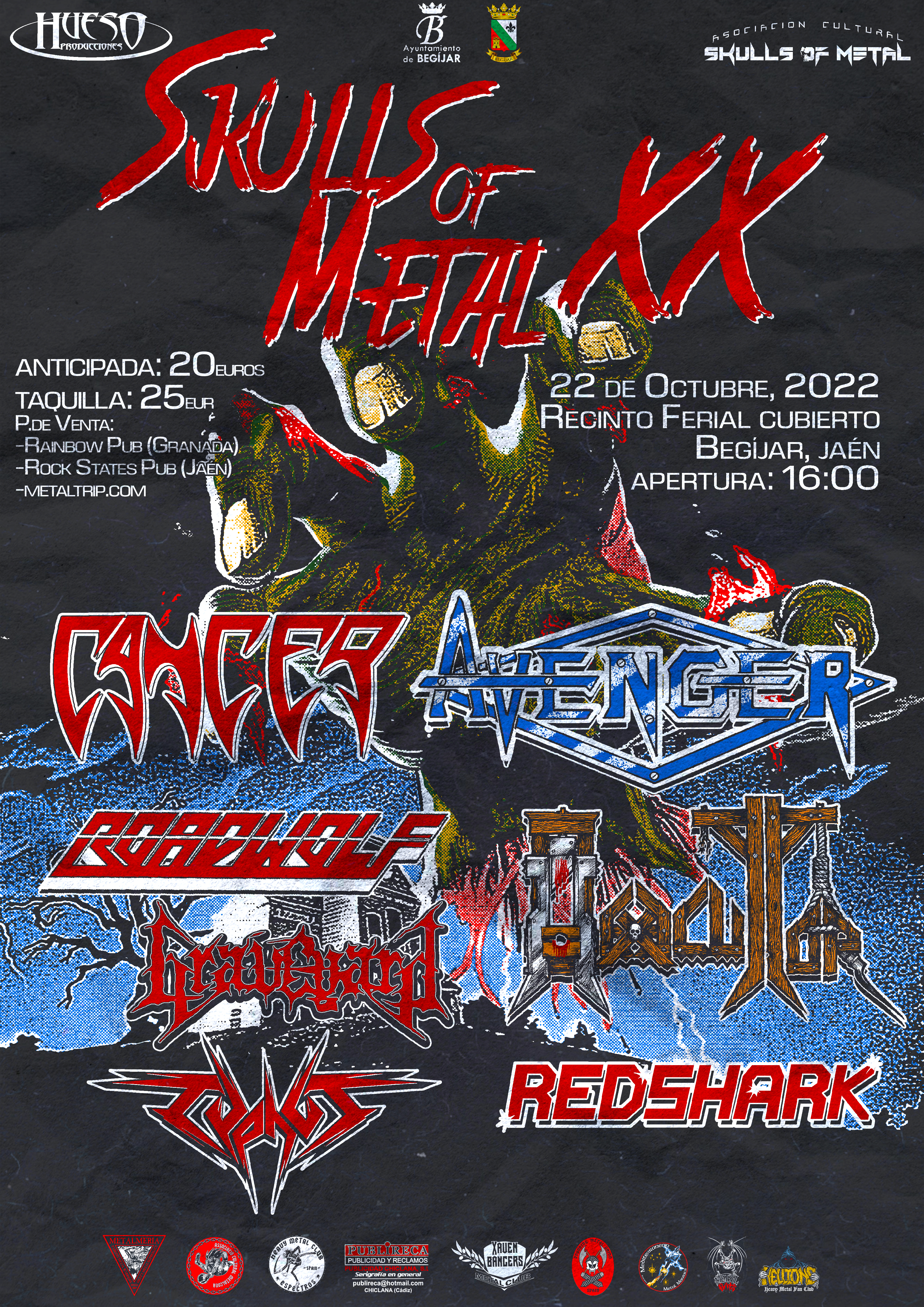 Skulls Of Metal Fest os presenta el cartel de este 2022, que tendrá lugar el día 22 de Octubre en Begijar, (Jaén), el festival confirma a las siguientes bandas: REDSHARK desde Cataluña con su potente «Heavy-Speed Metal» nos presentarán su último gran trabajo «Digital Race», desde Grecia vendrá TYPHUS, los últimos ganadores del W:O:A: Metal Battle, a deleitarnos con su combinando «Thrash Metal /Speed Metal» y presentado también su último trabajo «Mass Produged Perfection». La banda barcelonesa/Sueca, GRAVEYARD también descargará su «death metal puro sueco», al estilo más clásico, también presentado su último disco «Hold Back the Dawn». Desde tierras Galas nos conquistaran HEXECUTOR, con su «Thrash» más feroz y primitivo, presentarán también su gran aclamado álbum «Beyond Any Human Conception of Knowledge…» . De la profunda Austria ROADWOLF es una banda de «Hard Rock» y «Heavy Metal» formada en 2011 y que desde entonces lleva dando caña, publicando demos, singles, EPs y por fin, el 2020 presentaron su primer disco y debut de larga duración, “Unchain the wolf” , pura adrenalina «Hard Heavy» nos harán disfrutar de una gran noche. La vieja escuela del «death metal» estará presente en el Skulls of Metal Fest , este año con un clásicazo CANCER ; una leyenda y nombres más importantes de este género del Reino Unido, junto a Bolt Thrower y Benediction, y escucharemos temas de toda su carrera desde sus clasicos álbumes «To the Gory End»(1990), «Death Shall Rise» (1991) hasta su gran regreso con su último trabajo “Shadow Gripped»(2018), presentando también a su nueva formación con Daniel Maganto (Eternal Storm, Liquid Graveyard) Bajo y Gabriel Valcázar(Aposento) Batería, junto al indiscutible líder y fundador de Cancer, John Walker Voz Guitarra.Y por último los británicos AVENGER, Heavy metal de Newcastle, es una banda con una base de heavy clásico a lo NWOBHM con tendencias al «speed», y nos harán disfrutar de sus discografía más clásica, «Blood Sports»(1984) y «Killer Elite»(1985)..