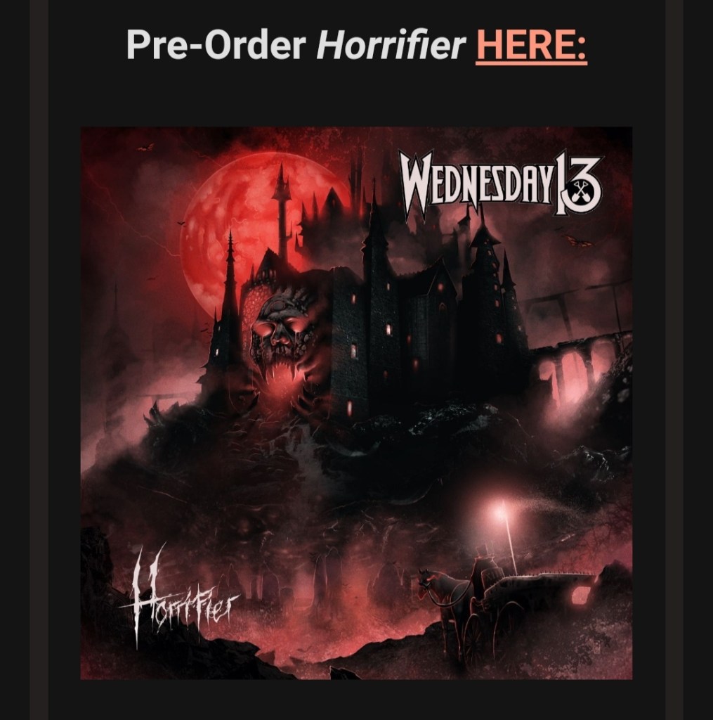 El heraldo indiscutible del metal horror MIÉRCOLES 13 anunció recientemente su muy esperado próximo álbum de himnos terriblemente sombríos y maravillosos, titulado Horrifier, que saldrá el 7 de octubre de 2022 a través de Napalm Records. Después del aclamado Necrophaze de 2019 (#2 US Heatseekers), con Horrifier, el exlíder del renombrado supergrupo de terror punk Murderdolls revitaliza su sonido con una energía punk intensamente divertida y una actitud metálica.