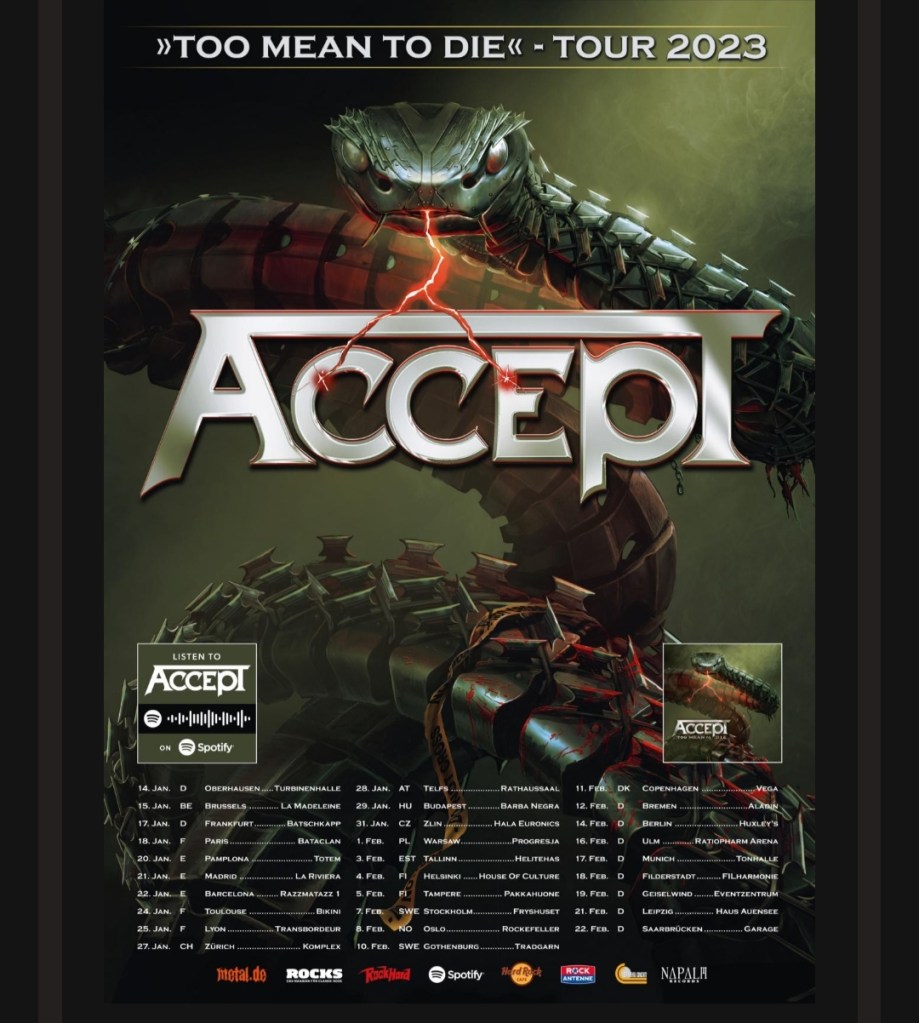 Después de una pausa relacionada con el virus, ACCEPT comenzará su tan esperada gira «Too Mean To Die» el 14 de enero de 2023 en Oberhausen. Los teutones de metal realizarán una gira por Europa desde mediados de enero hasta finales de febrero, tocando 29 conciertos en 13 países, diez de ellos solo en Alemania