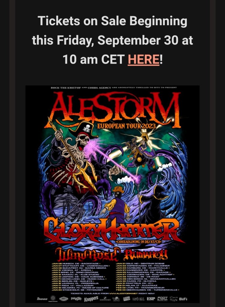 ¡Oh, vaya! Tras el lanzamiento de su séptimo álbum de larga duración aclamado por la crítica, Seventh Rum of a Seventh Rum, los legendarios señores del metal pirata ALESTORM zarparán en una gira masiva por el centro de Europa, tocando en algunos de los mejores y más grandes recintos cerrados del continente. en enero y febrero de 2023. Junto a ellos estarán los magos intergalácticos del power metal GLORYHAMMER, quienes actuarán como cabezas de cartel en todos los espectáculos de Alemania, Austria y Suiza.