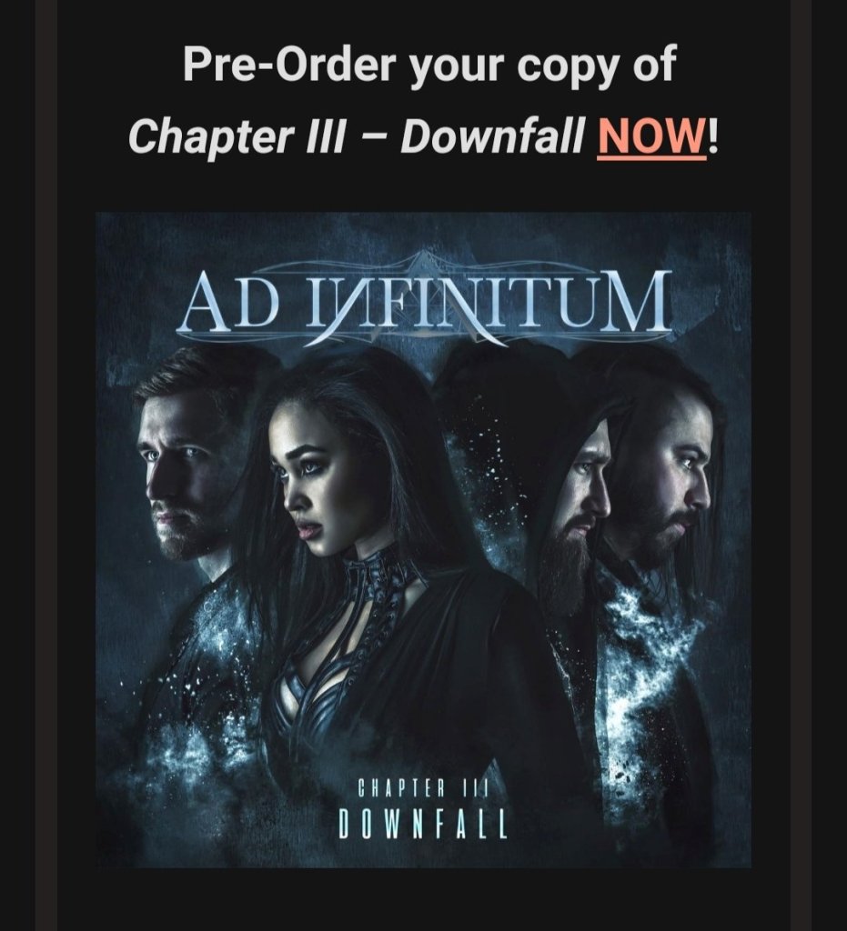 En 2023, el emergente grupo moderno de metal sinfónico AD INFINITUM vuelve a entrar en escena con su electrizante tercer álbum de estudio, Chapter III – Downfall, que saldrá el 31 de marzo a través de Napalm Records. El sonido característico de la unidad, que consiste en riffs pesados y modernos combinados con melodías vocales inquietantes de la increíblemente talentosa Melissa Bonny, los ha posicionado para una ascensión imparable en el mundo del metal. Tras el gran revuelo causado por canciones como «Marching on Versailles» e «Unstoppable», cada una de las cuales obtuvo más de 2,7 millones y 2,3 millones de reproducciones de video, respectivamente, hasta la fecha, esta próxima oferta proporciona otra ola de prueba del gran éxito que han tenido. obtenidos desde el lanzamiento de su álbum debut en 2020.