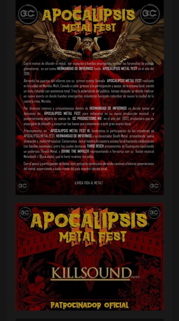 Abriendo las puertas del infierno con su primer evento llamado APOCALIPSIS METAL FEST realizado en la ciudad de Morelia, Michoacán.
