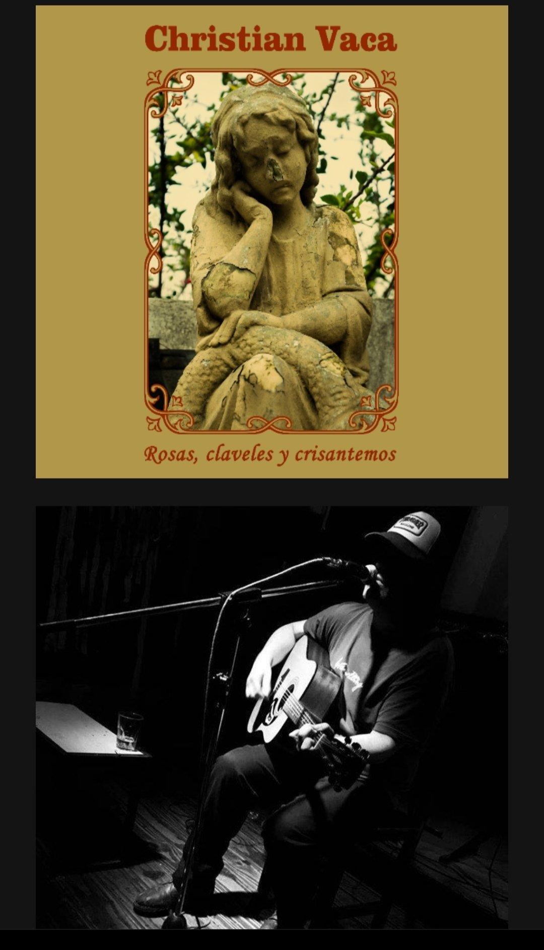 Guitarras distorsionadas, sonidos de armónica, cuerdas de nylon, voces sensibles y poesía nocturna conviven en Rosas, claveles y crisantemos, el nuevo disco de Christian Vaca, el cantautor de San Miguel, provincia de Buenos Aires, que sorprende con este nuevo registro de reciente edición, donde a su ya conocida propuesta folk suma guitarras desérticas y una atmósfera árida y candente, dando por resultado un stoner folk de melancolía espacial.