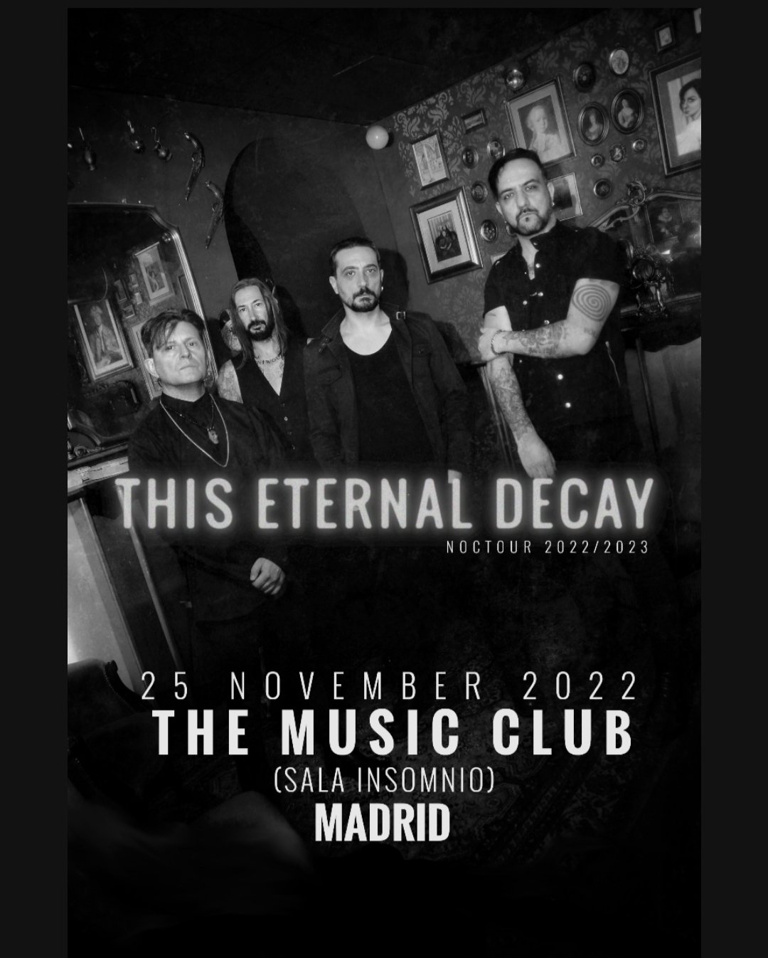 Todo esto se ve reflejado en las letras y en los sonidos oscuros que acompañan a estas nuevas canciones donde la banda no quiere hacernos buscar un camino de salida hacia la luz, pero si a un lugar más seguro dentro de las sombras. Con esta carta de presentación This Eternal Decay se presenta en Madrid con un directo potente, cargado de energía y que estamos seguros hará las delicias del publico de Madrid y Barcelona.