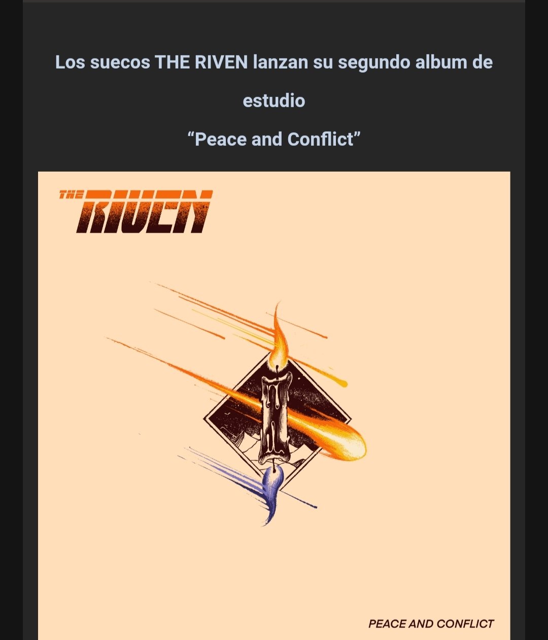 The Riven se encuentran actualmente en la fase de promoción de su segundo álbum de estudio de larga duración “Peace and Conflict”, los cuales empezaron a presentar por su gira peninsular en abril de este 2022. El álbum consta de nueve pistas contundentes que están disponibles en vinilo, CD y plataformas digitales desde el 25 de noviembre. El álbum ha sido editado y distribuido por The Sign Records. En este álbum participa el nuevo guitarrista Joakim Sandegård, quien junto con Arnau Diaz crean un clásico sonido de guitarras gemelas. También en este álbum detrás de la batería está Jussi Kalla, quien ya hizo su debut con la banda con los sencillos “Windbreaker / Moving On” lanzados en mayo de 2020.
