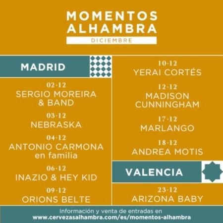 · Este mes de diciembre, Momentos Alhambra de otoño cierra a lo grande con 10 excelentes músicos: Madison Cunningham, Antonio Carmona, Andrea Motis, Marlango, Yerai Cortés, Sergio Moreira & Band, Arizona Baby, Orions Belte, Nebraska e Inazio & Hey Kid