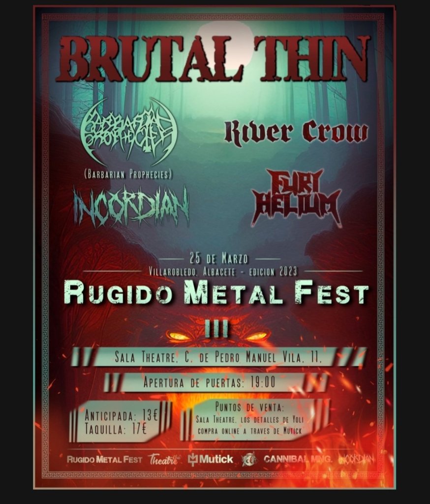 En esta ocasión el festival contará con 5 bandas del panorama nacional y los Algecireños Brutal Thin serán los encargados de encabezar dicha noche acompañados por Incordian, Barbarian Prophecies, River Crow & Furi Helium.