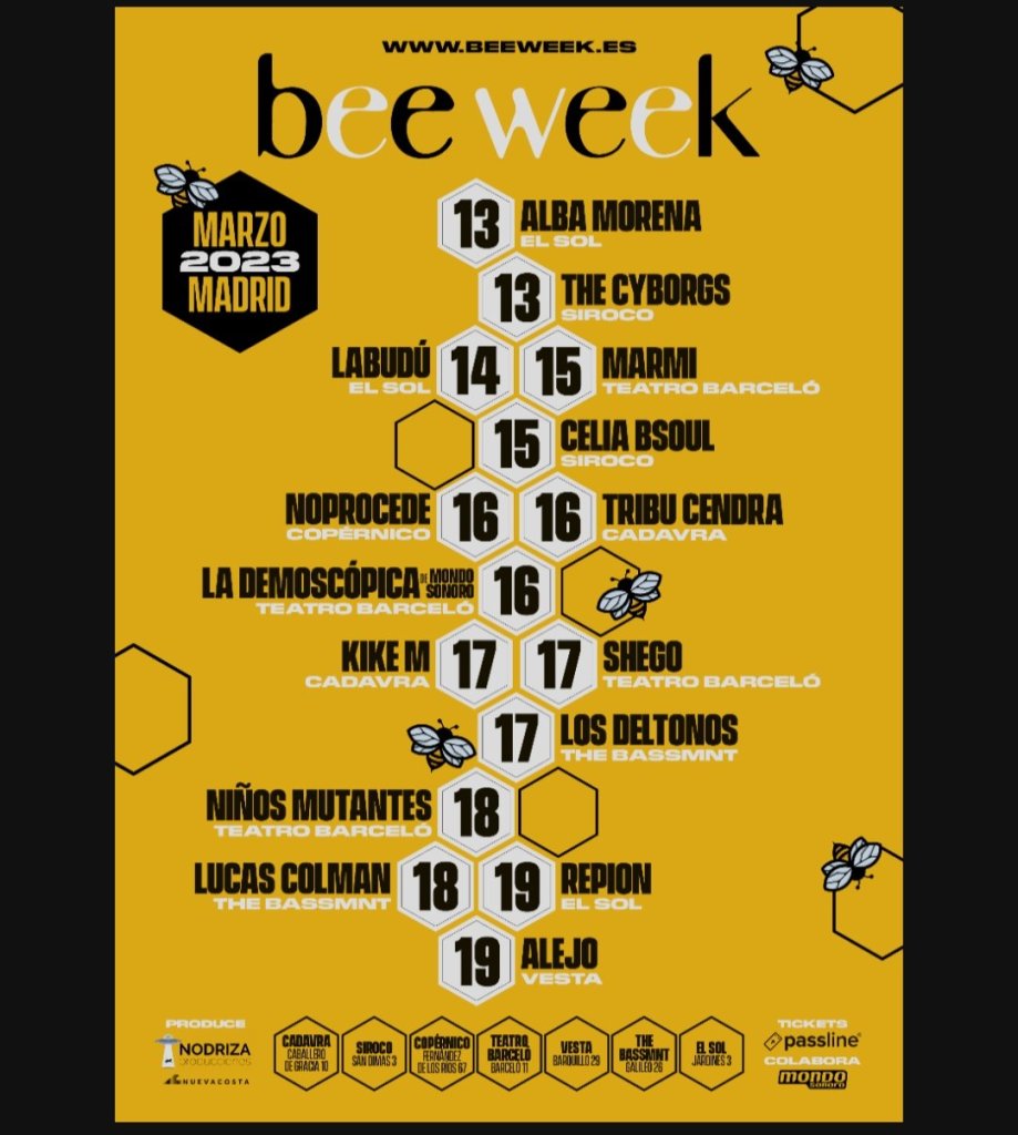 Del 13 al 19 de marzo llega a Madrid la primera edición de Bee Week, que pretende celebrar la llegada de la primavera, el comienzo de la polinización de las flores por parte de nuestras amigas las abejas y la música en directo en las mejores salas, las más representativas de nuestra capital.