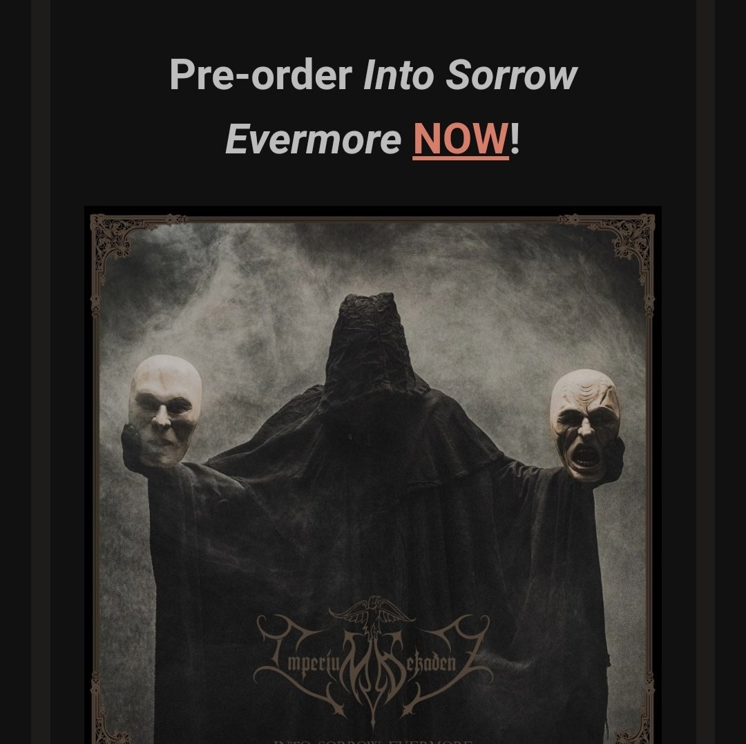 Desde que irrumpieron en la escena con su debut aclamado por la crítica, … und die Welt ward kalt und leer, en 2006, la banda ha desarrollado su propio sonido ambiental con un fuerte énfasis en la estructuración melódica y melodías crudas que están influenciadas por la segunda ola. del black metal noruego sin perder sus marcas únicas. Con ocho nuevas pistas que abordan temas de depresión, muerte y desesperación, IMPERIUM DEKADENZ se apega a sus inquietantes raíces y conquista los niveles superiores del mundo del black metal en Into Sorrow Evermore.