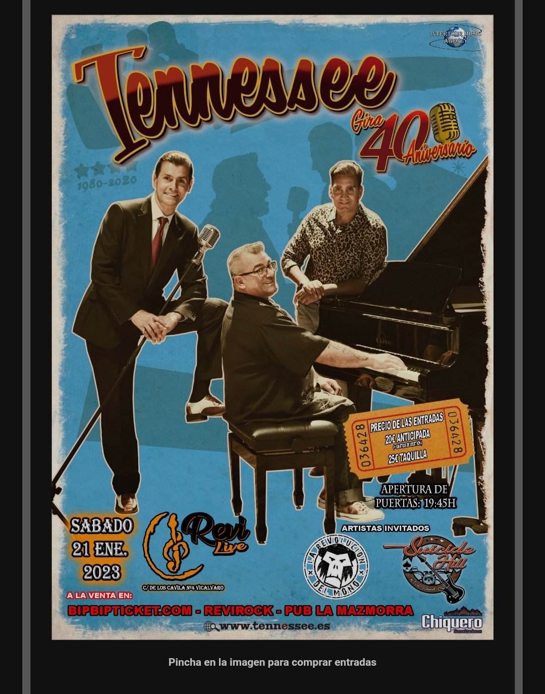El próximo día 21 de Enero, Tennessee celebrará en la sala Revi Live de Vicalvaro (Madrid), su gira de 43 aniversario. No os faltará ningun exito de la banda y quien sabe si habrá alguna sorpresa de última hora, pero por ahora lo que si os podemos adelantar es que estamos rozando el 50% del aforo, por lo que las entradas van a volar.
