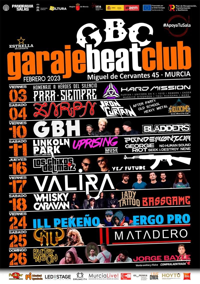 En las próximas semanas pasarán por Garaje Beat Club: GBH + BLADDERS // LINKOLN PARK [Tributo a LINKIN PARK] + UPRISING [Tributo a MUSE] // GEORGIE RIOT + NO HUMAN SOUND + SEEK & DESTROY + NENE // LOS CHIKOS DEL MAIZ // VALIRA // WHISKY CARAVAN + LADY TATTOO // WEASEL BUSTERS + VERGARATEK + HYDRO + DARK GENTLEMAN + MAG¡IX!!! + KAOTIN XAMAN // ILL PEKEÑO & ERGO PRO // TROPIKAL HIGH COLLECTIVE BRUTAL PARTY // ÑU // MATADERO CLUB // RUTO NEÓN + JORGE BAYLE… y muchos más.