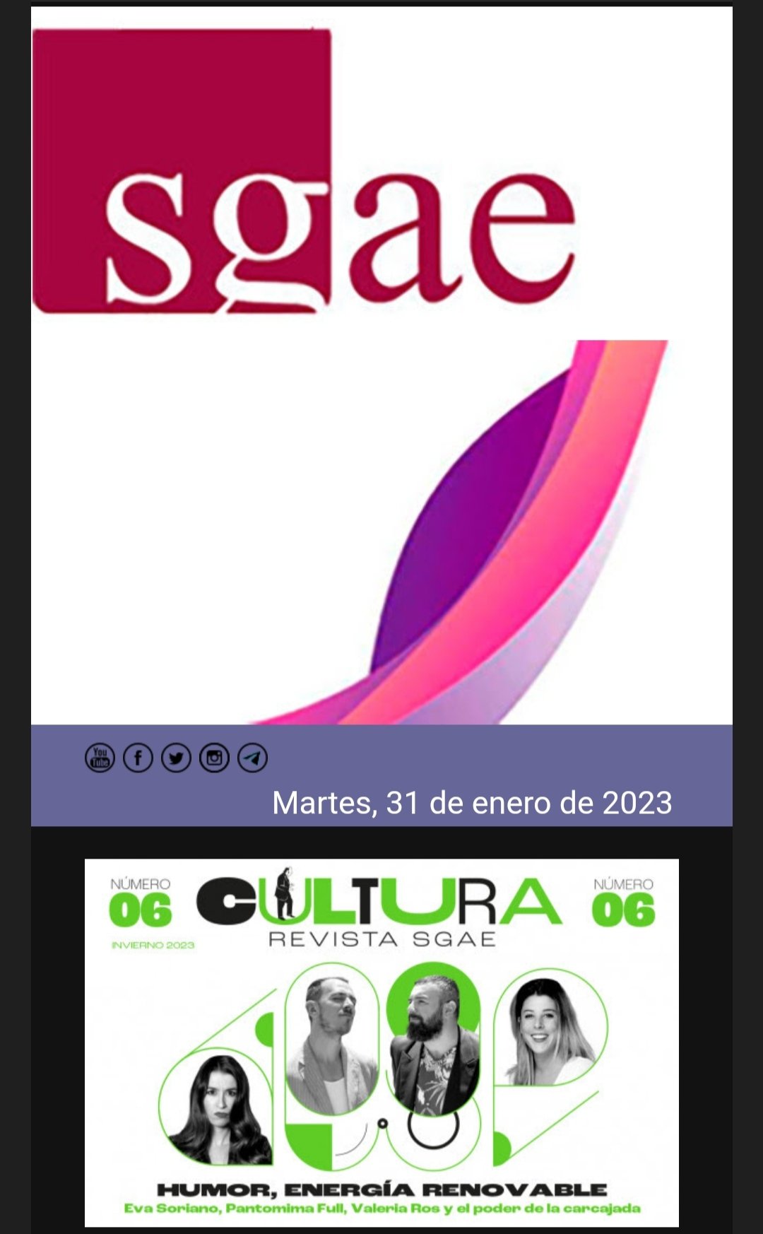 La Sociedad General de Autores y Editores (SGAE), a través de su departamento de Actividades Complementarias, presenta el nº6 de CULTURA REVISTA SGAE, una publicación digital creada para proyectar los valores musicales, audiovisuales y escénicos que hoy son tendencia. Para echarle un ojo, puedes hacer clic aquí o acceder en cultura.sgae.es