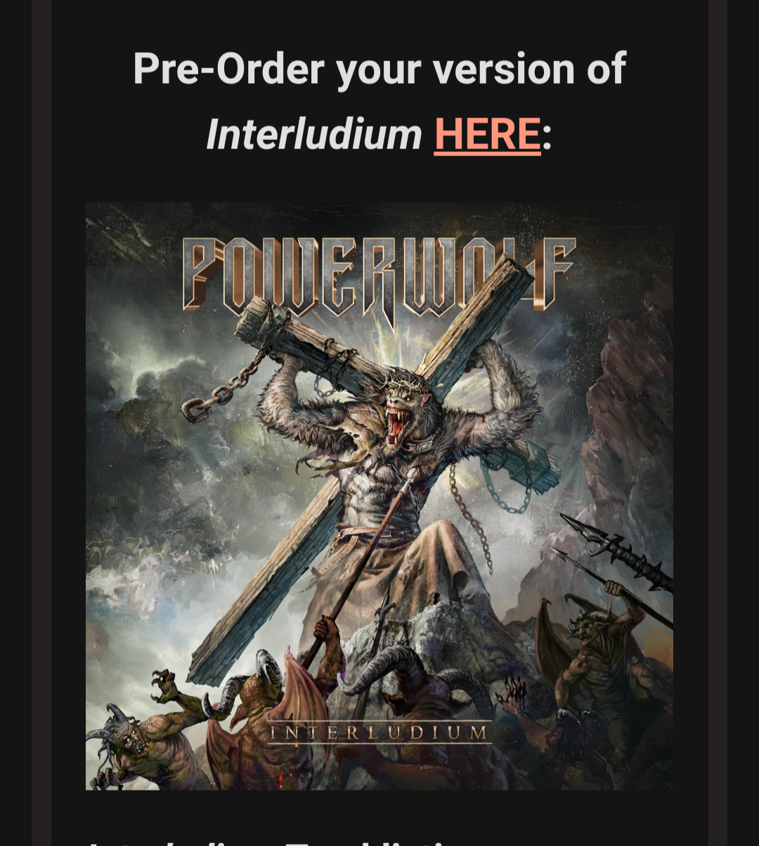 Justo a tiempo para la festividad cristiana más importante, la Pascua de 2023, otro hito de la discografía de la banda, el álbum especial Interludium, se lanzará el 7 de abril de 2023. El nuevo lanzamiento presenta seis nuevas pistas de estudio, incluido el sencillo «Sainted By The Storm». «, que ya se celebró en la emocionante gira Wolfsnächte 2022 de la banda, así como en una de las pistas más intensas en la historia de la banda, «My Will Be Done». Interludium también presenta gemas y rarezas de la historia de la banda, como «Midnight Madonna» y «Living On A Nightmare».