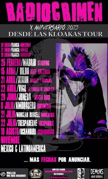 RadioCrimen, continúan presentando las nuevas canciones de su próximo álbum ‘Franki’, una Opera Punk que sirve para celebrar su X Aniversario y que llegará a las tiendas (físicas y digitales) el próximo 14 de Abril de 2023. Mientras, el quinteto bilbaíno sigue su actual gira “Desde Las Kloakas Tour”, que les ha llevado hace unas semanas a recorrer Francia junto a los míticos Pioneros del Punk, GBH y que continua por toda la península ibérica, mientras la gira por América (México, Guatemala, Honduras, El Salvador, Costa Rica, Colombia…) se anuncia para el Otoño de este año.