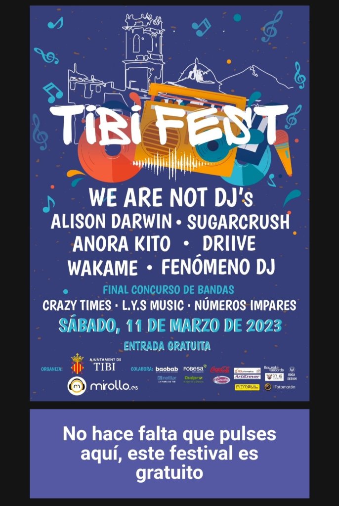 El 11 de marzo ya está marcado en azul en el calendario festivalero de este país. Con mucho trabajo y esfuerzo, la web musical MiRollo ha conseguido reunir a un buen puñado de bandas emergentes para ofrecer un día lleno de música y actividades en torno a la comarca de la Hoya de Alcoy. Tibi recibirá con honores a los castellonenses Anora Kito, a los ciudadrealeños Sugarcrush, a los barceloneses Alison Darwin, a los madrileños Driive, a los murcianos Wakame y al albeceteño Fenómeno DJ. La guinda la firmarán los súper festivaleros We Are Not Dj’s, en un día infinito en el que también se celebrará la final del concurso de bandas, en la que actuarán Crazy Times, L.Y.S. y Números Impares. La entrada es gratuita y libre a partir de las 13:00h.