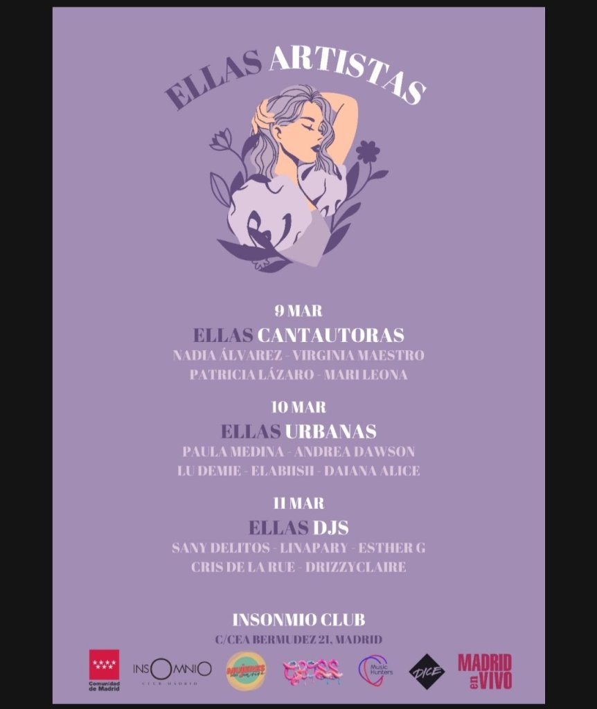 Los próximos 9, 10 y 11 de marzo The Music Club Insomnio (C/ Rea Bermudez 21, Metro Canal L2) se convertirá en el gran centro de la música femenina en Madrid. Tres días de intensa programación en la que las artistas femeninas serás las grandes protagonistas y donde podremos disfrutar de ellas en diferentes estilos. Por el escenario de la sala madrileña veremos pasar a cantautoras, artistas de música urbana y dj´s haciendo de esta programación el altavoz perfecto para poner en valor todo lo bueno que se viene haciendo desde hace mucho tiempo