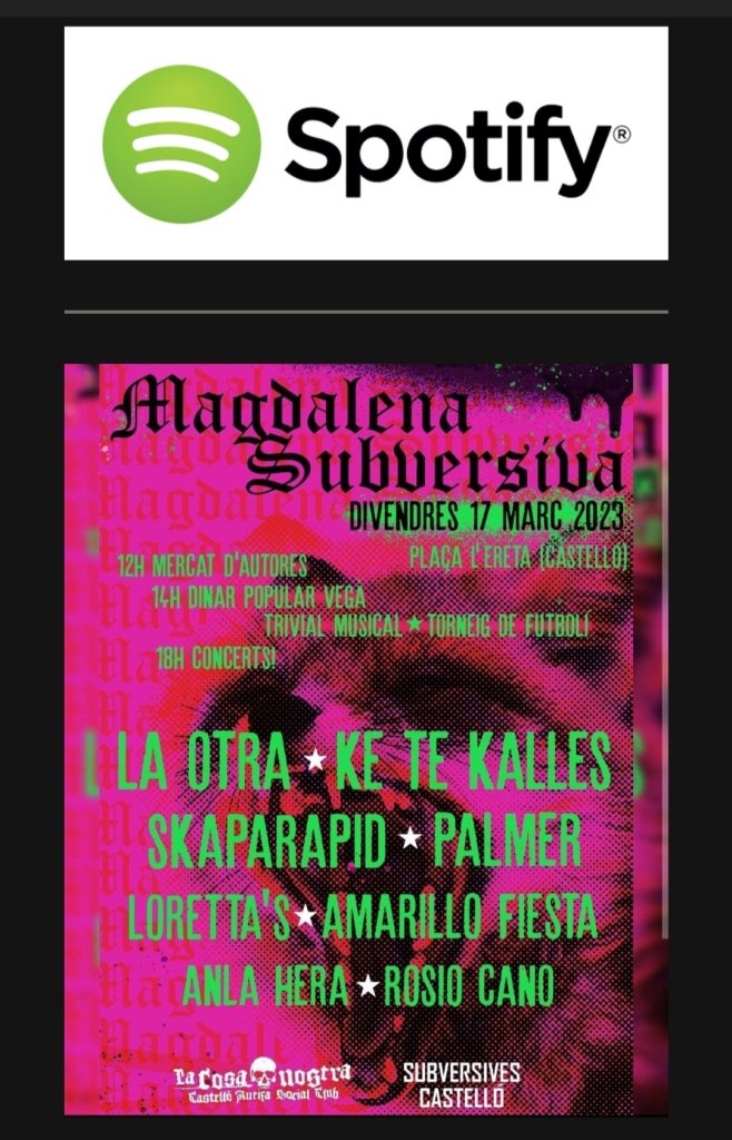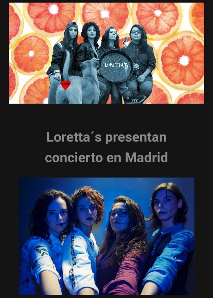 Las chicas de Loretta´s están metidas de lleno en la preparación de lo que será su nuevo trabajo. Esos preparativos no son obstáculo para que no disfrutemos de su potente directo. Después de su exitoso paso por Madrid la banda vuelve a la senda de los conciertos tocando en casa. Será el próximo 17 de marzo en las fiestas de Magadela Subversiva en Castellón. Un evento cargado de actividades y diversos actos que tendrán como punto álgido los conciertos que empezarán a partir de las 18 horas