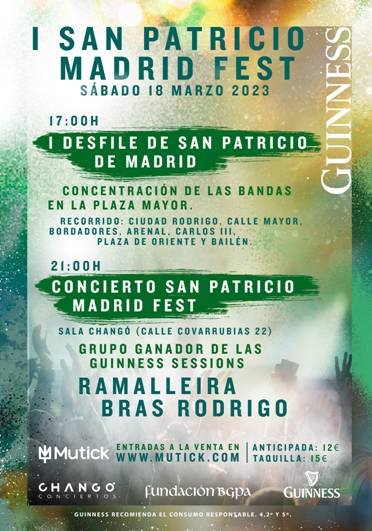 • Como parte del I San Patricio Madrid Fest, ese mismo día Sábado 18 de Marzo, a las 21h., habrá un concierto en la Sala Changó (Calle Covarrubias, 42 <Metro> Bilbao, Alonso Martínez o Iglesia) de los grupos: Ramalleira, Bras Rodrigo y el Grupo Ganador de la Guinness Sessions.