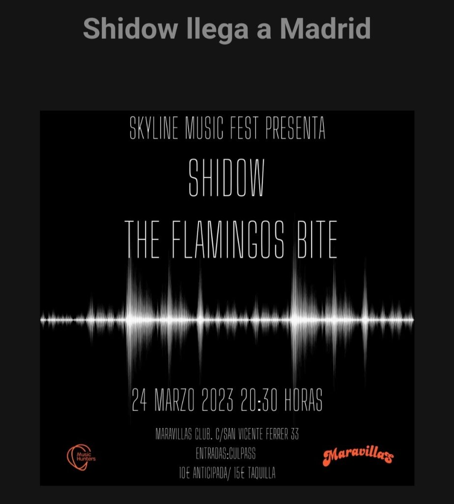 La espera ha llegado a su final, por fin podremos disfrutar en Madrid del directo de Shidow. La banda andaluza llega de nuevo a la capital para presentar su nuevos temas. Una propuesta muy cuidada y elegante que se extiende a sus conciertos. Shidow estará el 24 de este mes en la sala Maravillas junto a otra banda de esas que hay que tener siempre en el radar, The Flamencos Bites estarán poniendo en escena las canciones que componen su último trabajo Big Little Town. Las entradas para este concierto se pueden adquirir en el siguiente enlace