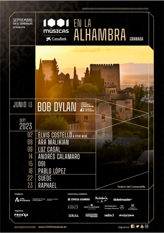 Bob Dylan actuará en el Teatro del Generalife el próximo 13 de junio a las 21:30hrs en un concierto coproducido por 1001 Músicas – CaixaBank, el Festival Internacional de Música y Danza de Granada y con el especial patrocinio de CaixaBank.