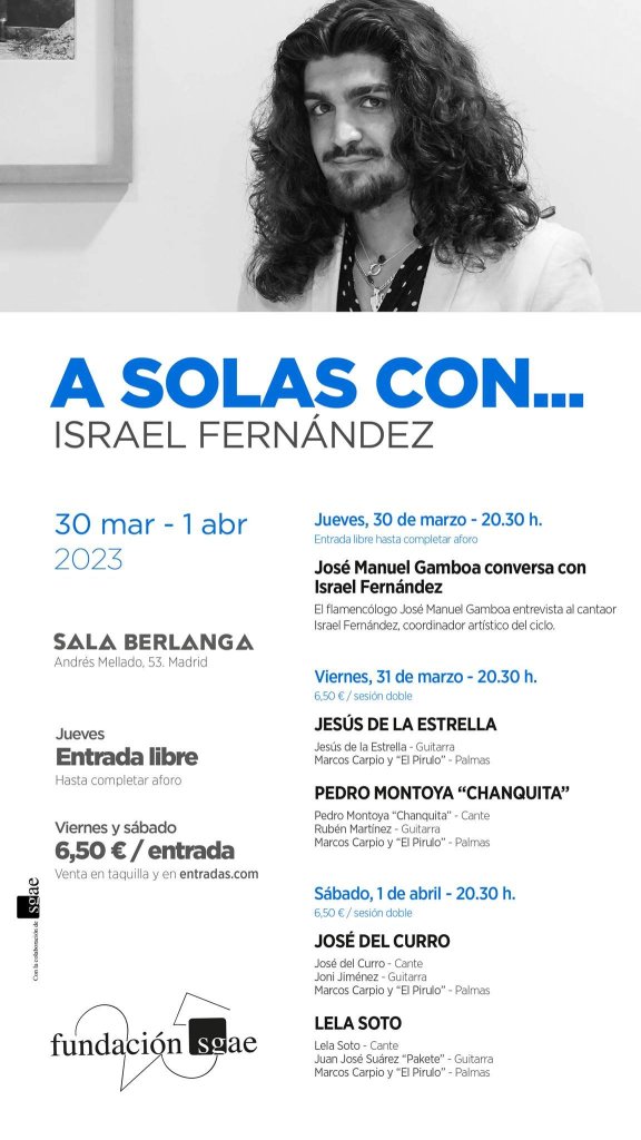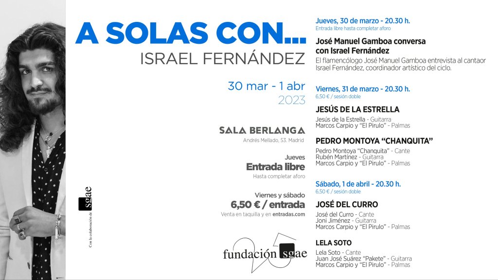 La Fundación SGAE se acerca al proceso creativo del cantaor flamenco Israel Fernández en A solas con… Israel Fernández, una forma de conocer sus métodos y sus procesos a través de una charla con el periodista y flamencólogo José Miguel Gamboa, con entrada libre hasta completar aforo. Además, Fernández ejercerá como coordinador artístico para las dos jornadas de música que completan esta actividad con las actuaciones de: Pedro Montoya “Chanquita”, Lela Soto, José del Curro y Jesús de la Estrella. La Sala Berlanga de Madrid (c/ Andrés Mellado 53. Entradas a un precio de 3,50 euros a la venta en taquilla y entradas.com) acogerá esta muestra del 30 de marzo al 1 de abril, a partir de las 20.30 horas.