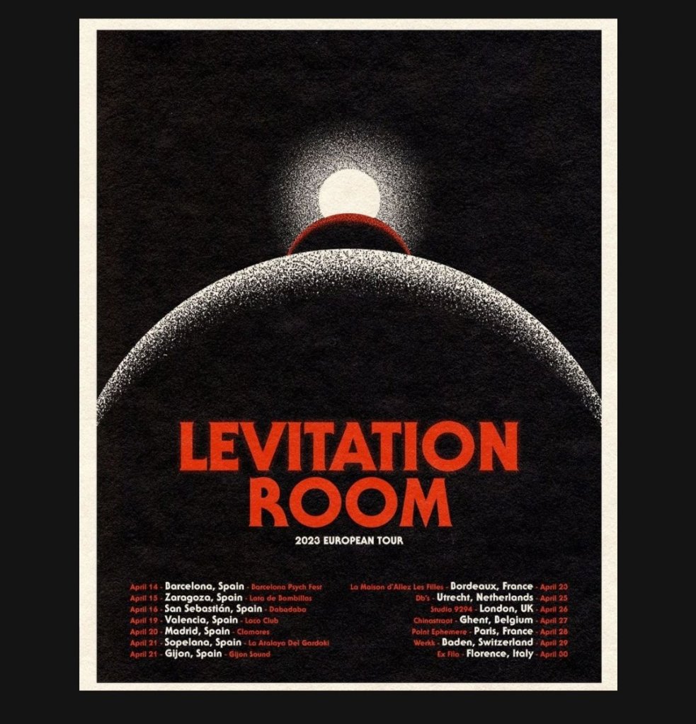 Esta semana comienza la gira española de los norteamericanos Levitation Room, que darán conciertos en siete ciudades de nuestro país. El próximo viernes 14 de abril de marzo empezarán su tour en el festival Psych Fest de Barcelona, para continuar en Zaragoza (15 de abril, La Lata de Bombillas), San Sebastián (16 de abril, Dabadaba), Valencia (19 de abril, Loco Club), Madrid (20 de abril, sala Clamores), Sopelana (21 de abril, La Atalaya del Gardoki) y Gijón (22 de abril, Gijón Sound).